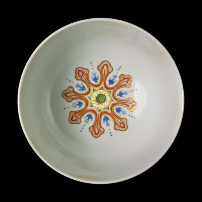 The exterior is decorated with symmetrical landscape medallions amidst rococo style floral, the interior is centered by a large eight-petaled rosette.