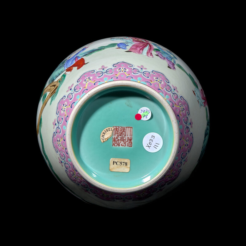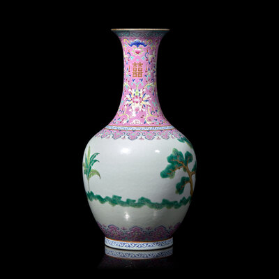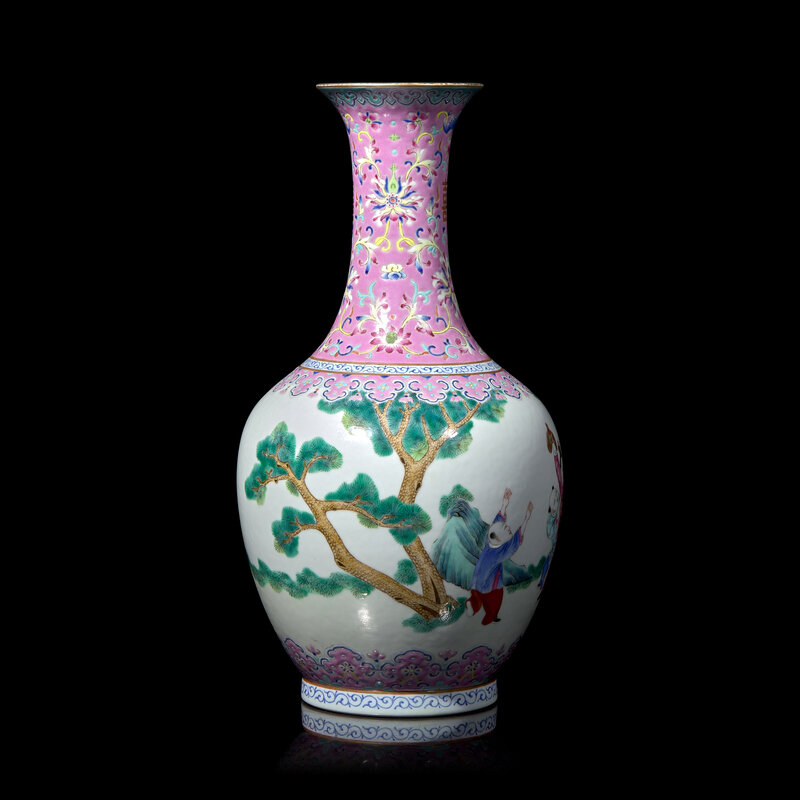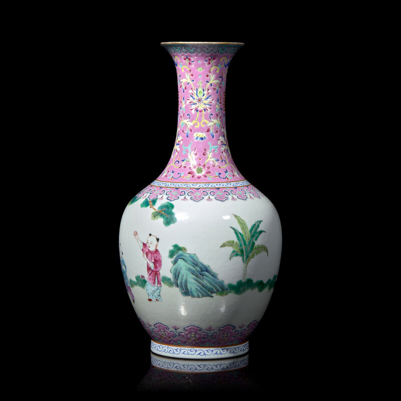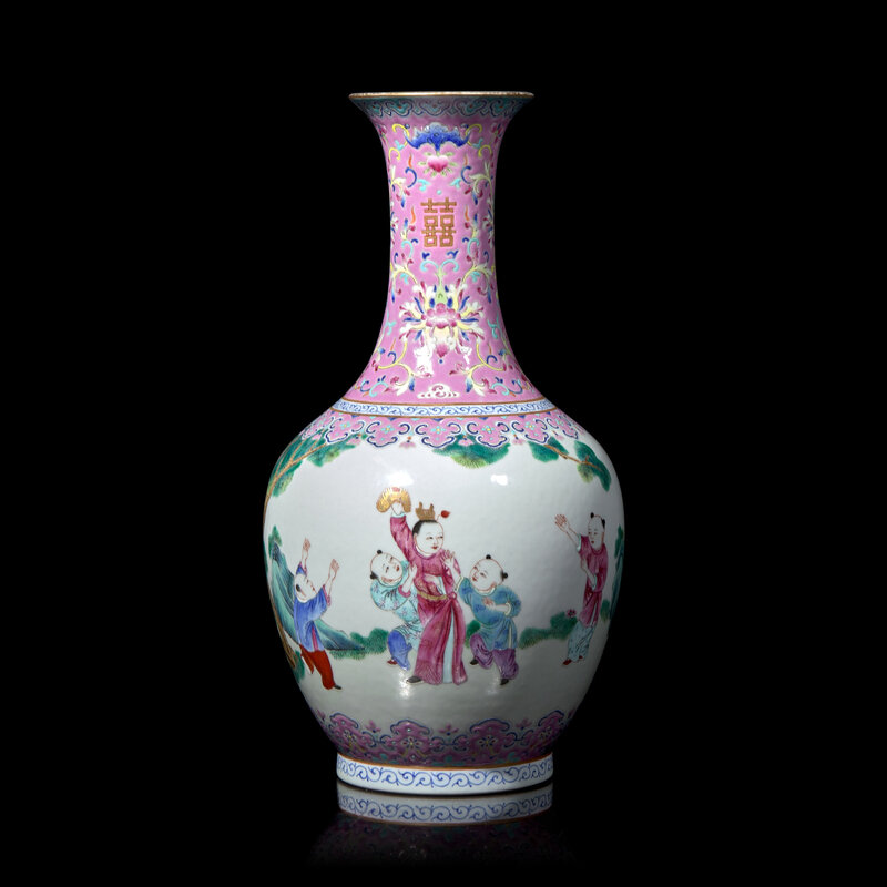 The main panel of the ovoid body painted to show boys at play in a landscape, between two bands of ruyi heads, the waisted neck decorated with lotus scrolls and shuangxi characters against a pink enameled ground, the everted mouth rim gilt, the interior of the mouth and the underside glazed turquoise, bearing an apocryphal iron red Qianlong six-character mark.