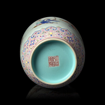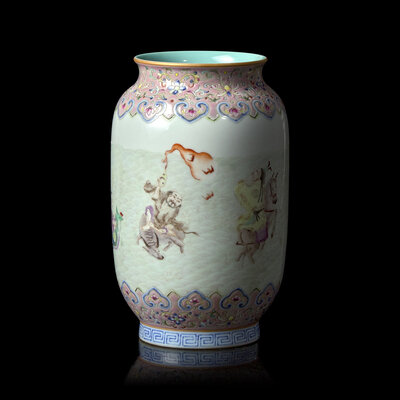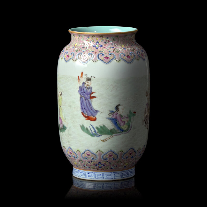 Decorated with the Eight Daoist Immortals Crossing the Ocean, lappet and lotus scroll borders to the neck and base, fret border to foot, underside with six six-character Qianlong seal mark.