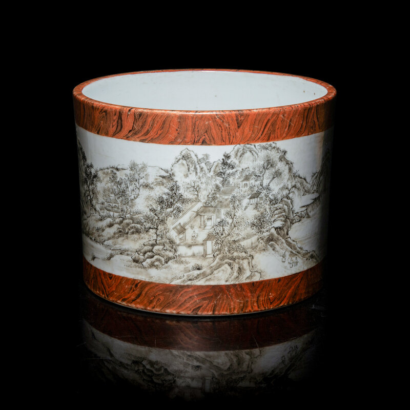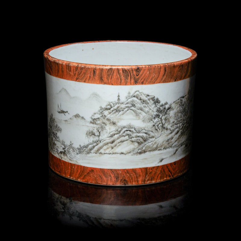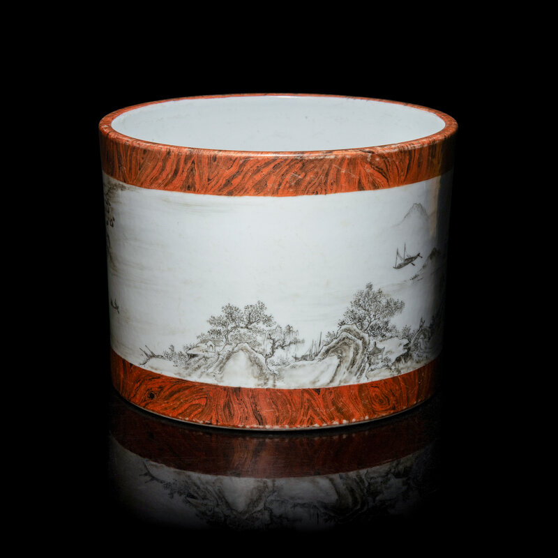 A Chinese Faux Bois and Grisaille Decorated 'Landscape' Brush Pot
