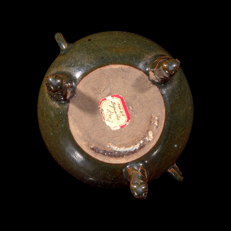 Inspired by archaic forms, the waisted neck with slightly everted lip, stylized beast handles, all on three short cabriole legs with beast masks at the knees, with a grainy dark green glaze draining to brown.