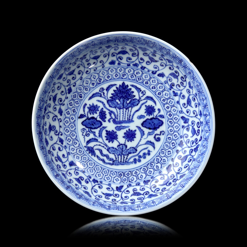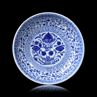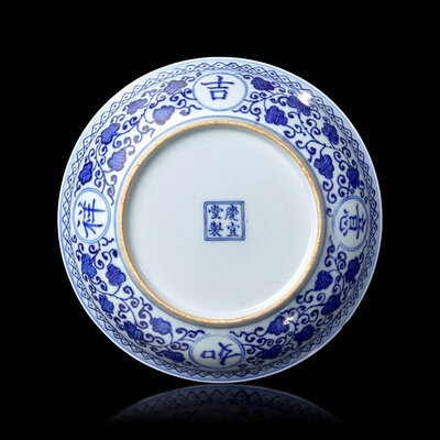The interior is decorated with three bands of motifs, centered by a flower and foliage, the reverse with four characters "Ji Xiang Ru Yi" (Auspicious and as one wish) among continuous flora sprays, the underside with four characters "Qing Yi Tang Zhi" mark.