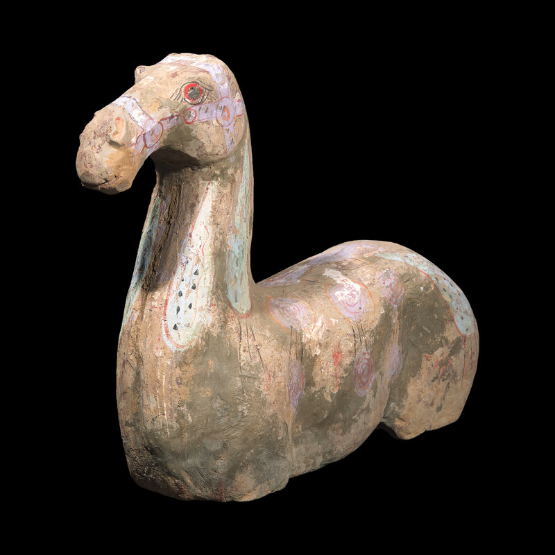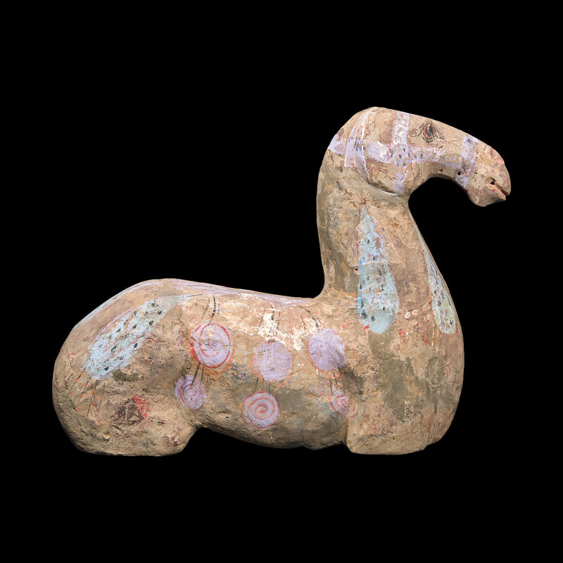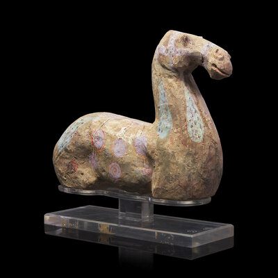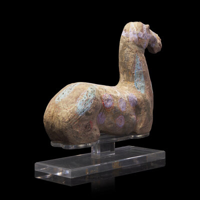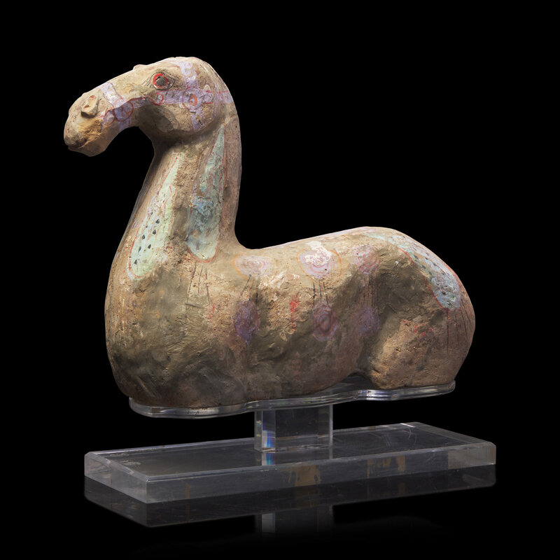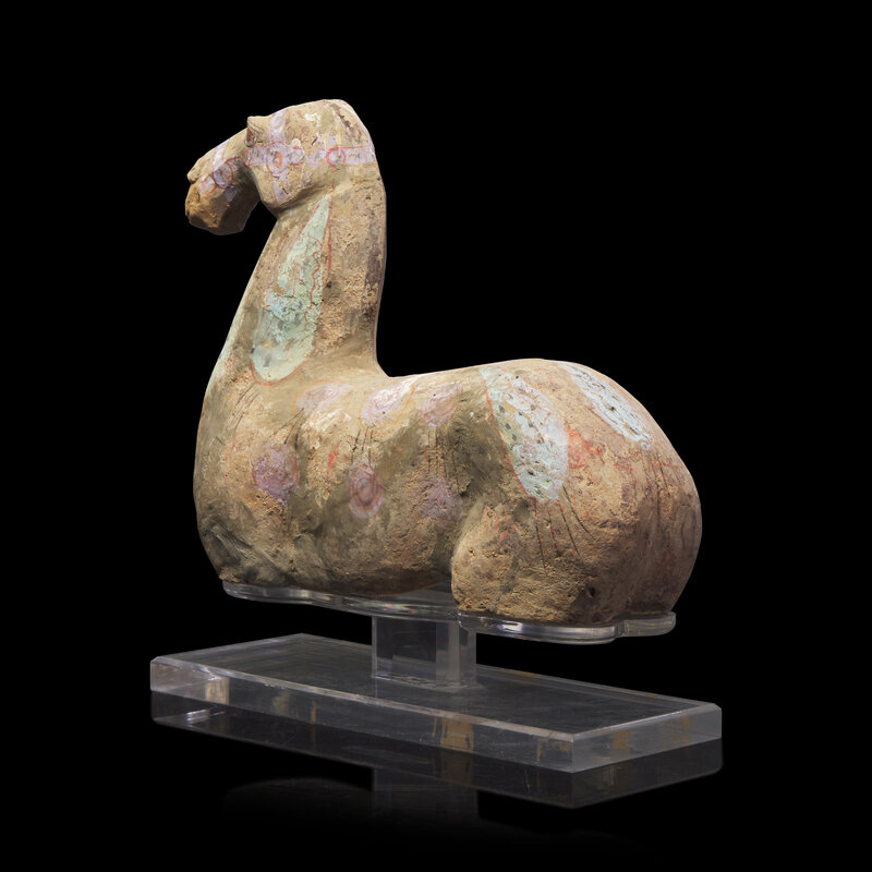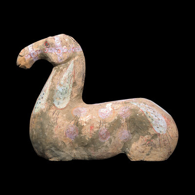 A Chinese Painted Grey Pottery Figure of Recumbent Horse, Han Dynasty