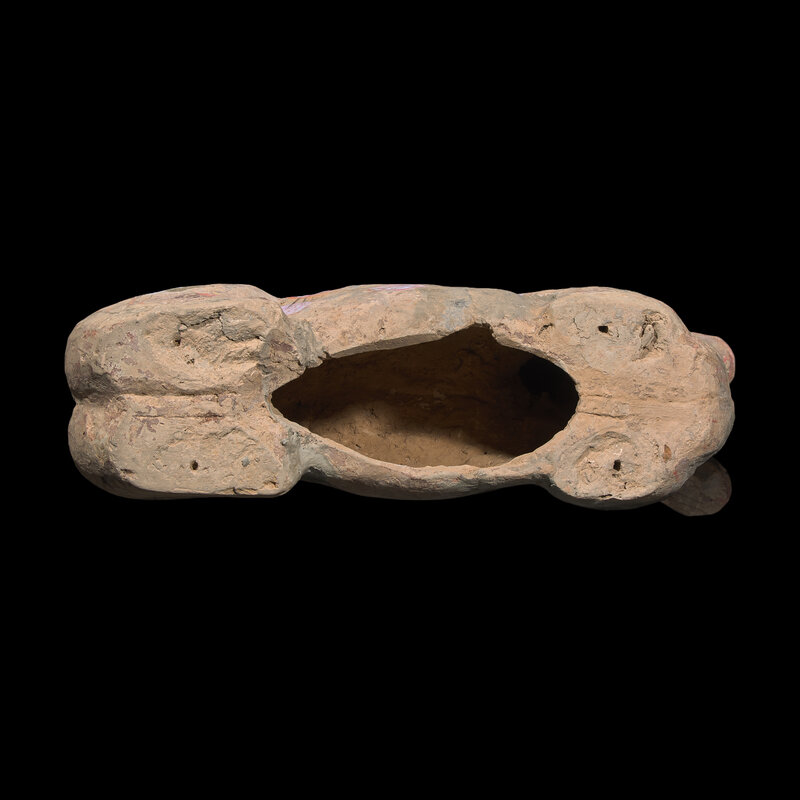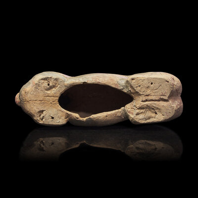 Molded with stylized cheekbones, protruding eyes, and flared nostrils over the open mouth. Four rectangular apertures on the underside for the legs, two round apertures to head for ears, and an aperture for tail.