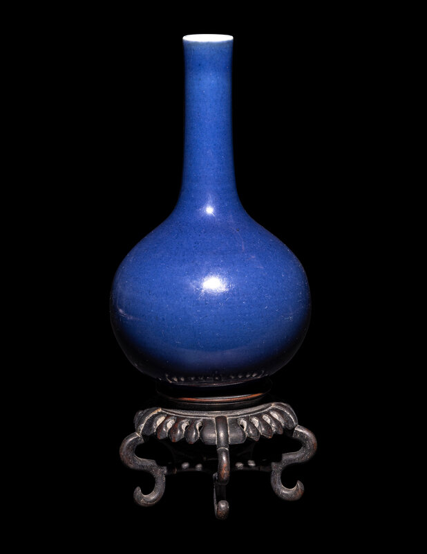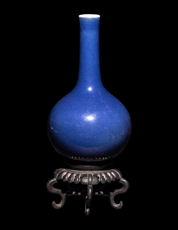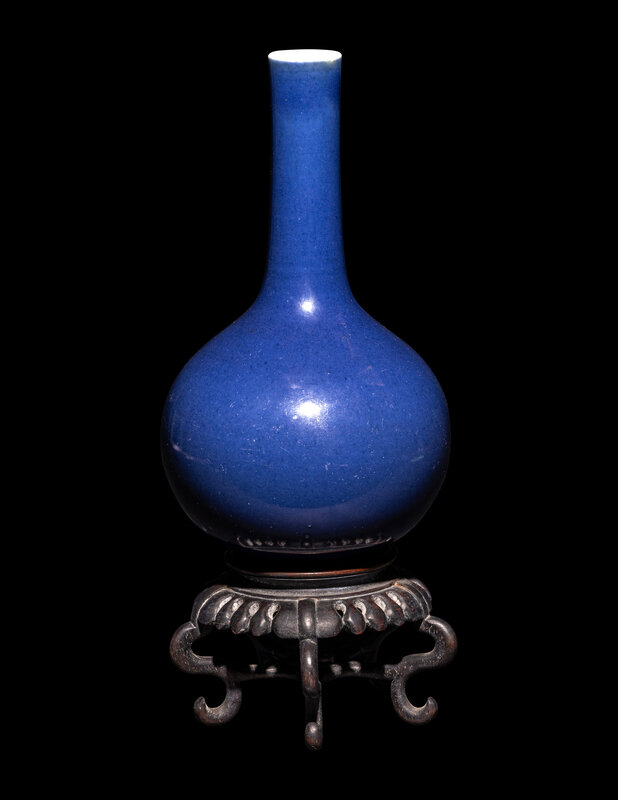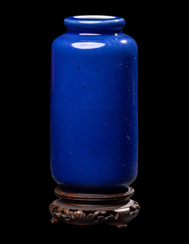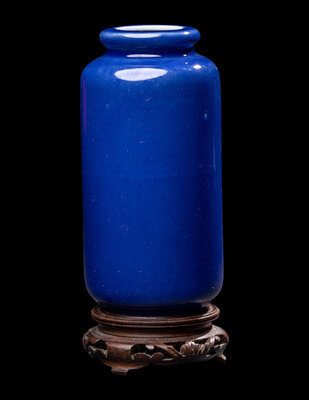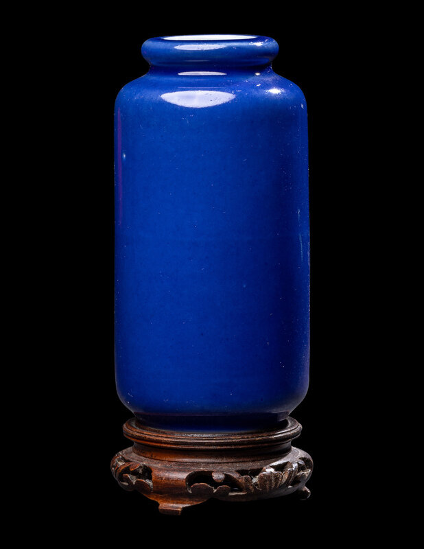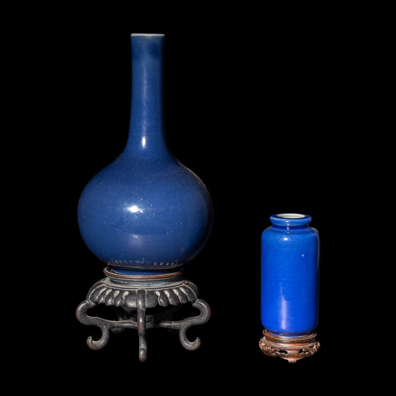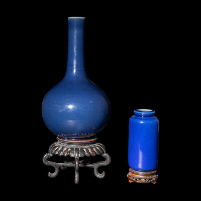 The first a bottle vase, the low globular body supported by a high foot ring, with sloping shoulders constricting to an elongated cylindrical neck, supported by a well-carved fitted hardwood stand; the second a cylindrical vase rising to a recessed neck and a dished mouth, together with a fitted hardwood stand.