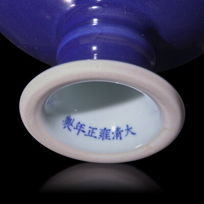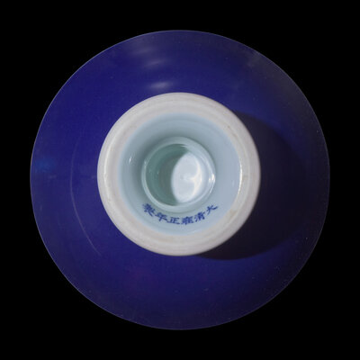 Covered with an even blue glaze, six-character Yongzheng mark to the interior of the footring.