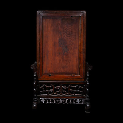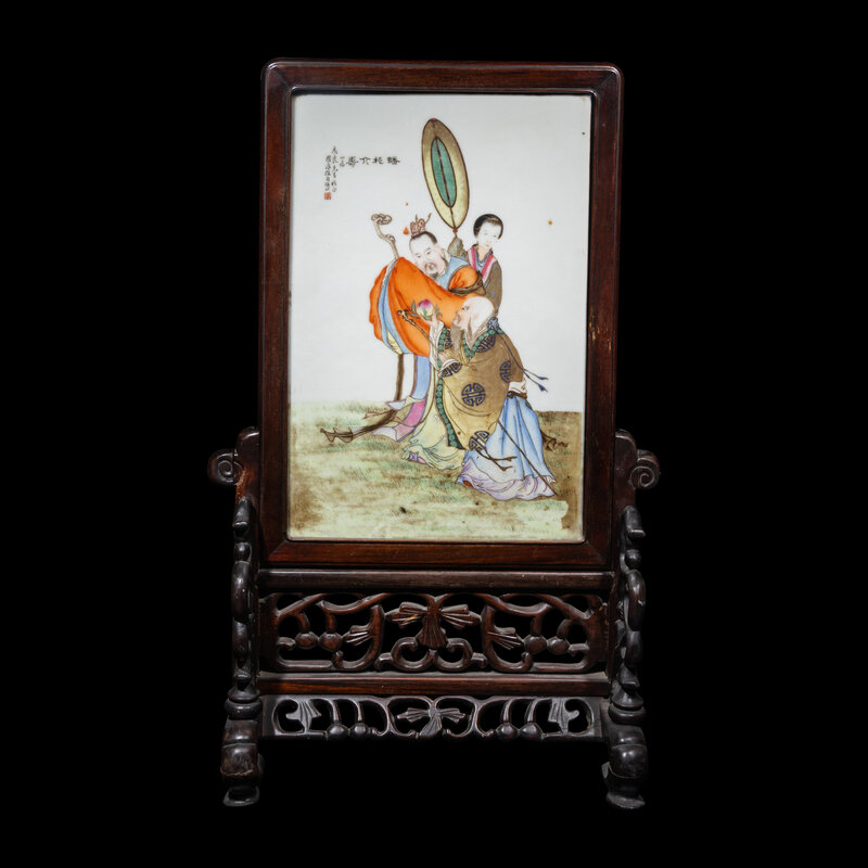 近代 红木嵌粉彩蟠桃獻壽圖瓷板插屏