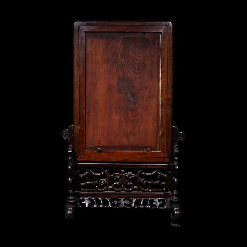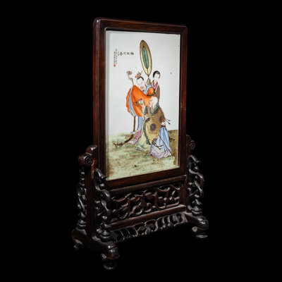 A Chinese Famille Rose Porcelain Plaque Inset Hardwood Table Screen, 20th Century
