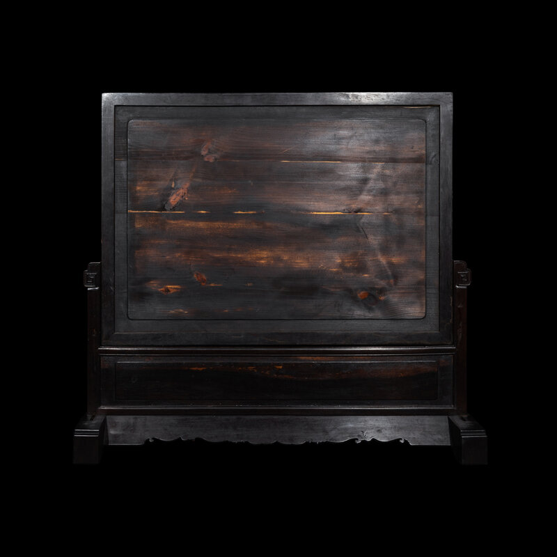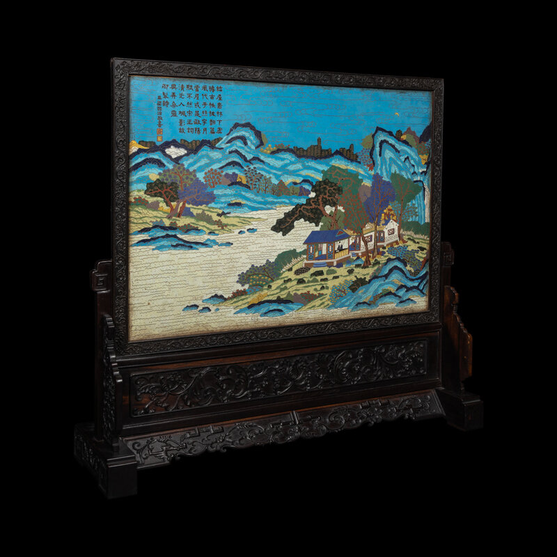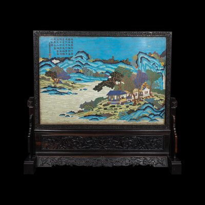 Depicting a scholar seated in a pavilion conversing under trees, overlooking a lake and misty mountains in the distance, all finely worked in polychrome enamels, hardwood frame and stand.