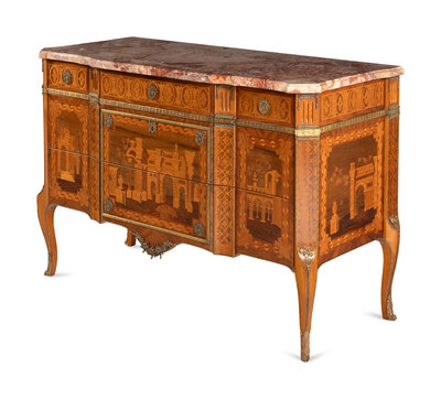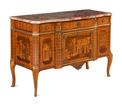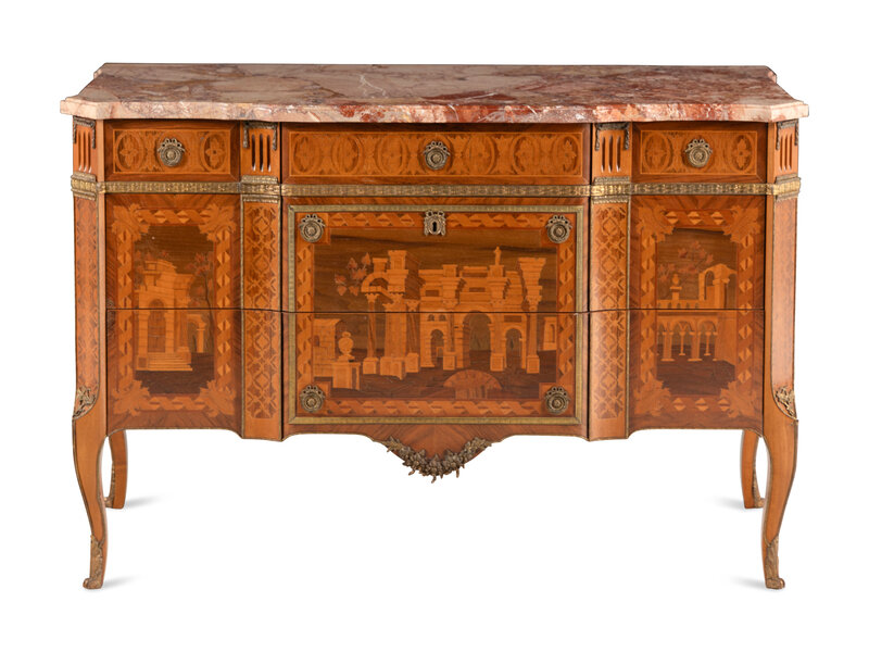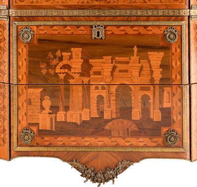 in the Louis XV/XVI transitional taste, inlaid to depict ruins and classical architecture.