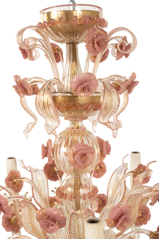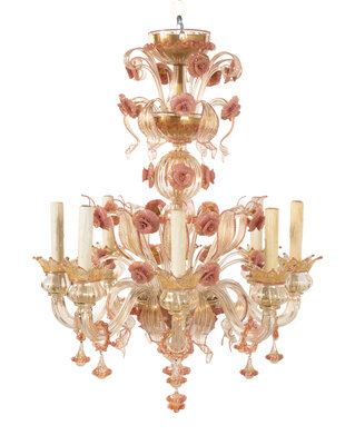 A Venetian Pink, Opaque and Colorless Glass Eight-Light Chandelier