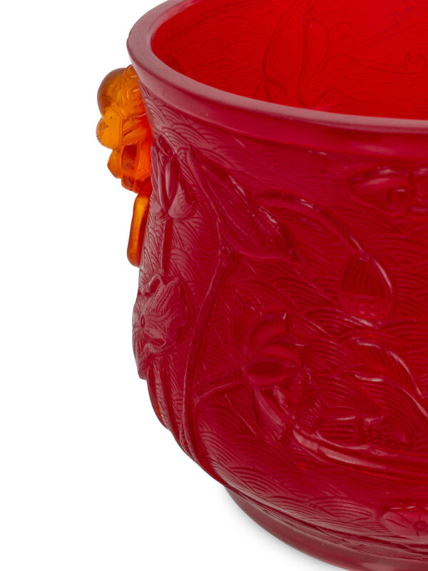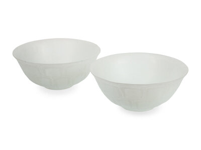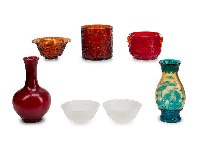 comprising a pair of opaque bowls, a brush pot, bowl, two vases, and a jardinière.
