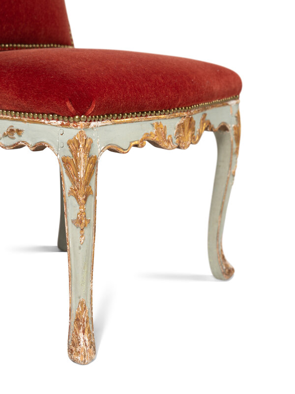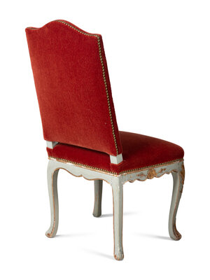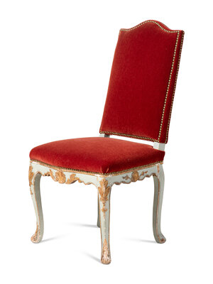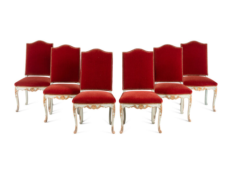 A Set of Six Louis XV Blue Painted and Parcel-Gilt Dining Chairs