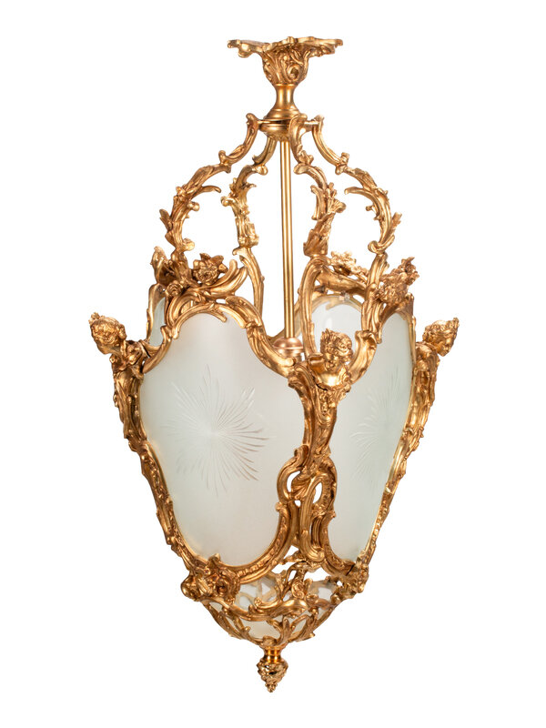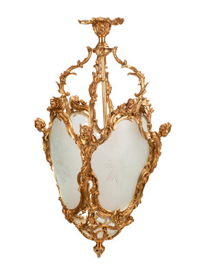 A Pair of Louis XV Style Gilt Bronze and Etched Glass Hall Lanterns