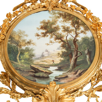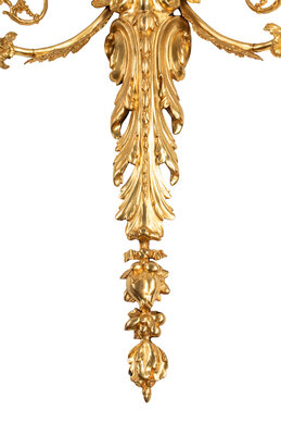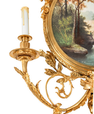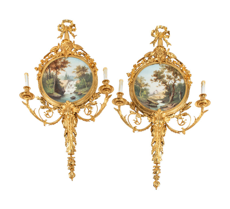 A Pair of Large Louis XV Style Gilt Bronze and Porcelain Two-Light Sconces