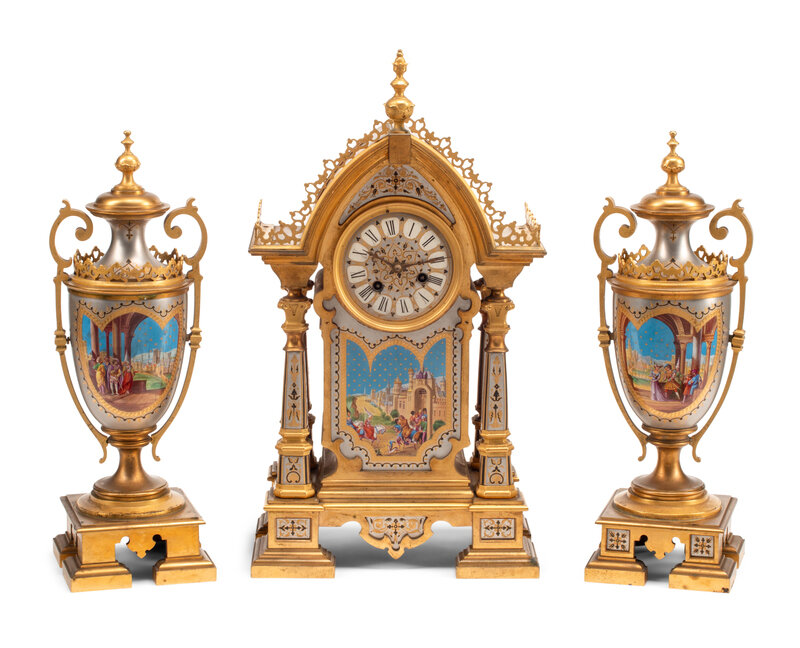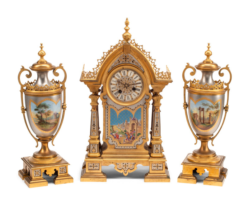 A French Gilt and Silvered Bronze and Porcelain Clock Garniture