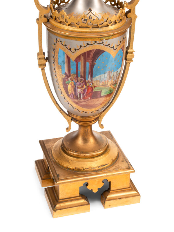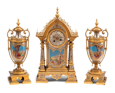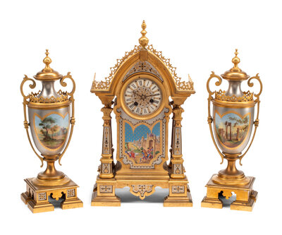 comprising a clock and pair of urns; the clock movement stamped 'GF' and further numbered '492'; the porcelain panels marked indiscernibly in iron red to underside.