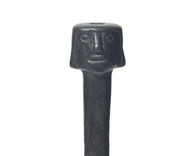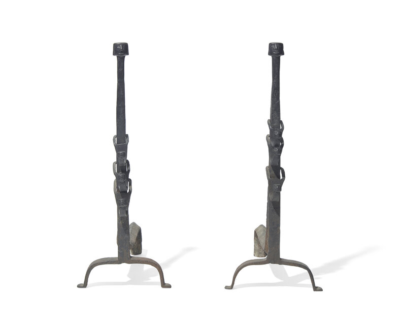 Each with three hooks for brace bars or skewers, the terminals in the form of human faces, surmounted by human head knob finial.