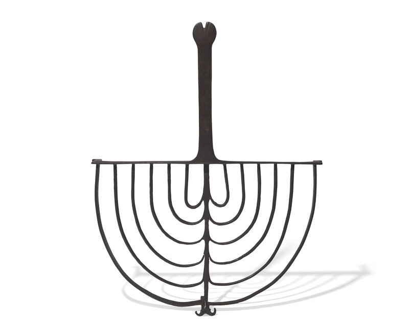 Of semicircular form, with radiating bars, one foot with ram's head-form finial, the handle with notched terminal.