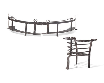 The fireplace guard / plate stand probably American and likely late 18th century, hinged at center, having lower gallery and upper rail, with six uprights having heart-form terminals; the pot stand probably French, 17th / 18th century.