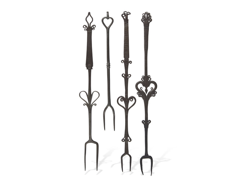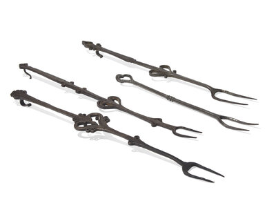 A Group of Four Wrought Iron or Steel Roasting Forks, Probably French or Flemish, 18th Century