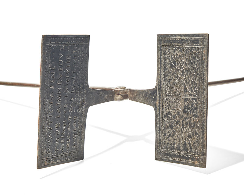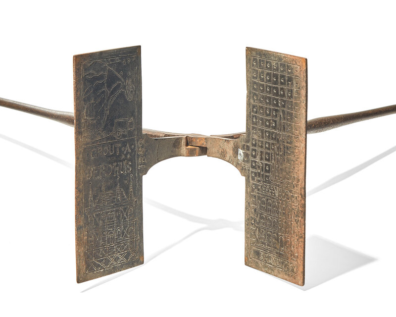Each with double-sided press depicting various imagery; the first, Belgian, depicting woman cooking at a fireplace, and Brussels townscape with buildings, inscribed, "Grout a Berdhuis/ 1862," and "Bruxelles/ H.B."; the second, depicting potted flowering tree, and inscribed, "japartien a rene toque lainne veuve dorizon ce i janviie 1835 fat par moi louis boulay"; the third, depicting birds, dog, and deer, and inscribed, "IL" and "C.G. F.C./ 1780"; the fourth, depicting lions flanking fleurs-de-lis, with stars and hearts surrounding, and inscribed, "B" and "JPB"; and the last, of small size with round press, depicting urn with tulip and rosette with concentric designs.