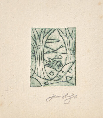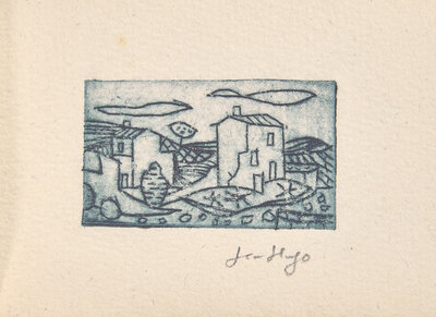 (Ales): PAB, 1957. First and limited edition, #19/22 numbered copies, signed by Frenaud on colophon. Oblong 48mo. Illustrated with an etched plate by Hugo, signed by him in pencil below image. Publisher's stiff printed grey wrappers.
