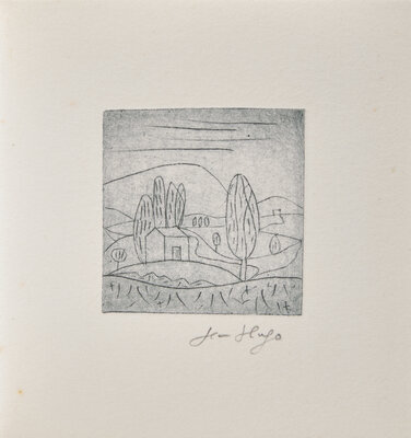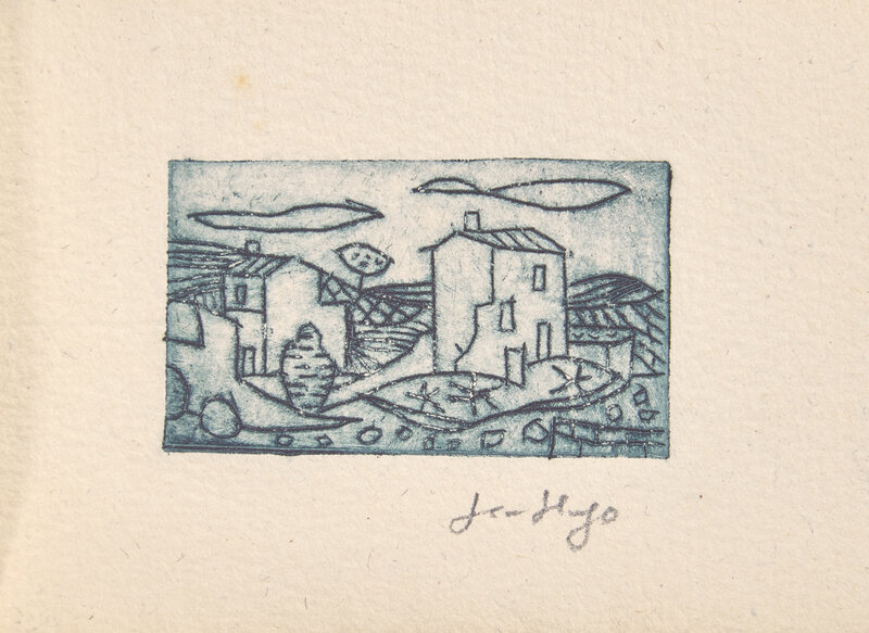 Ribaute-les-Tavernes: PAB, September 22, 1967. First and limited edition, #11/22 numbered copies (from a total edition of 25). Oblong 48mo. Illustrated with a drypoint etching by Hugo, signed by him in pencil below image. Publisher's stiff printed white wrappers, in glassine.