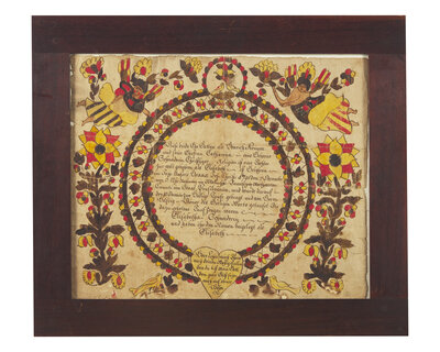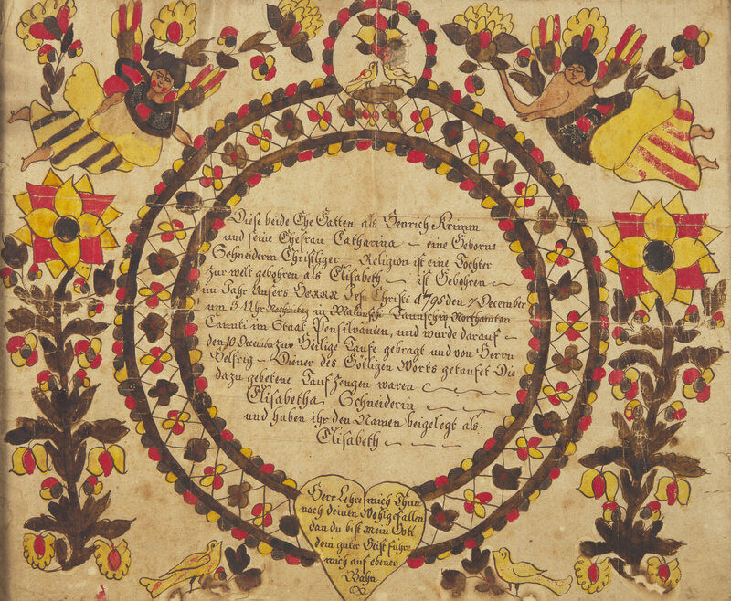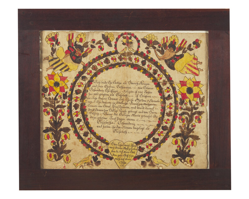 A Fraktur Birth and Baptism Record, Attributed to The Blowsy Angel Artist, Northampton County, Pennsylvania