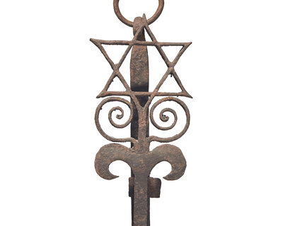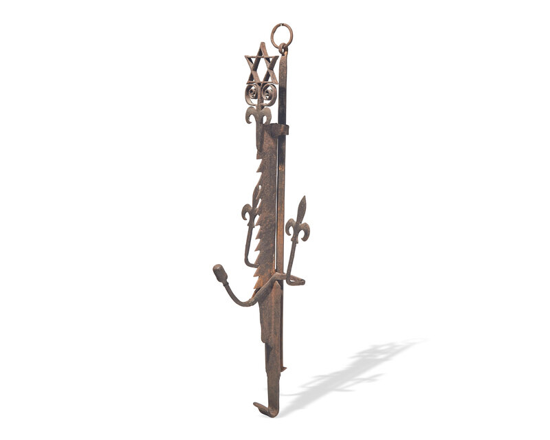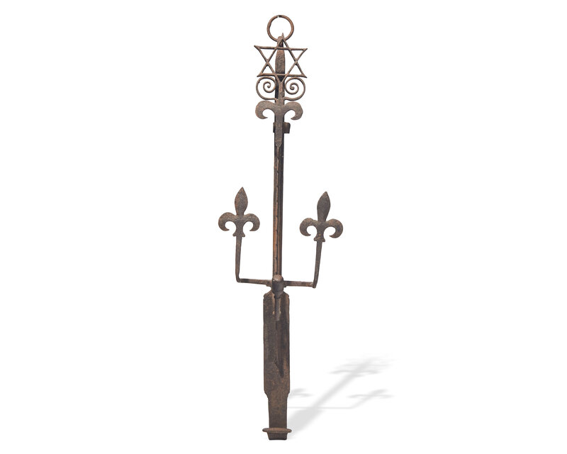 With terminals in the form of fleurs-de-lis, the upper center terminal Star of David surmounting scrolled devices.