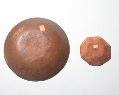 A shallow bowl incised with compass star and flowering vine bearing old paper label with attribution to Leidy, the second of octagonal form, incised with flower blossom, bears accession number,"03-374."