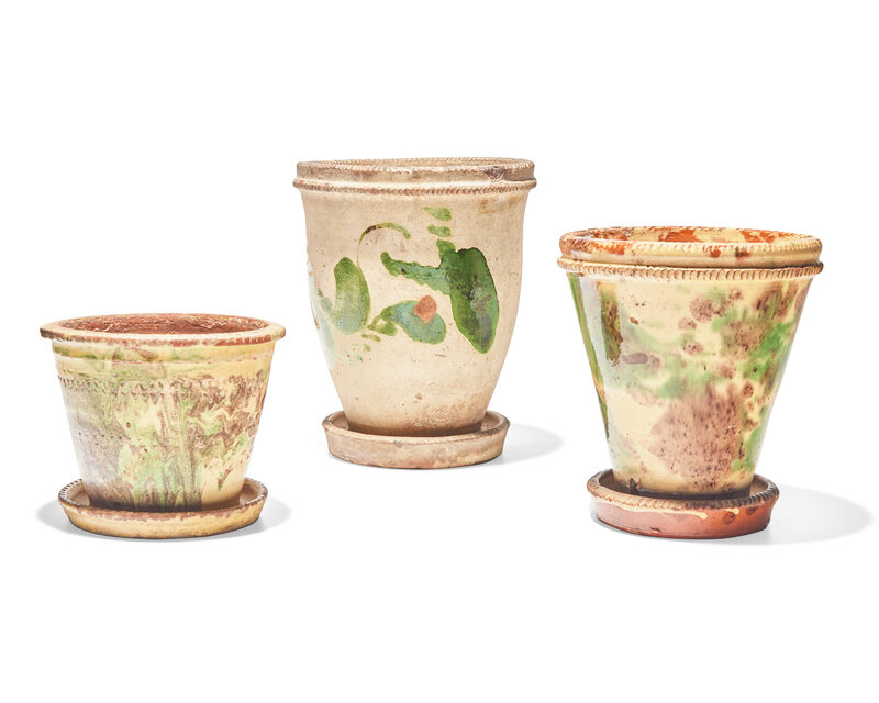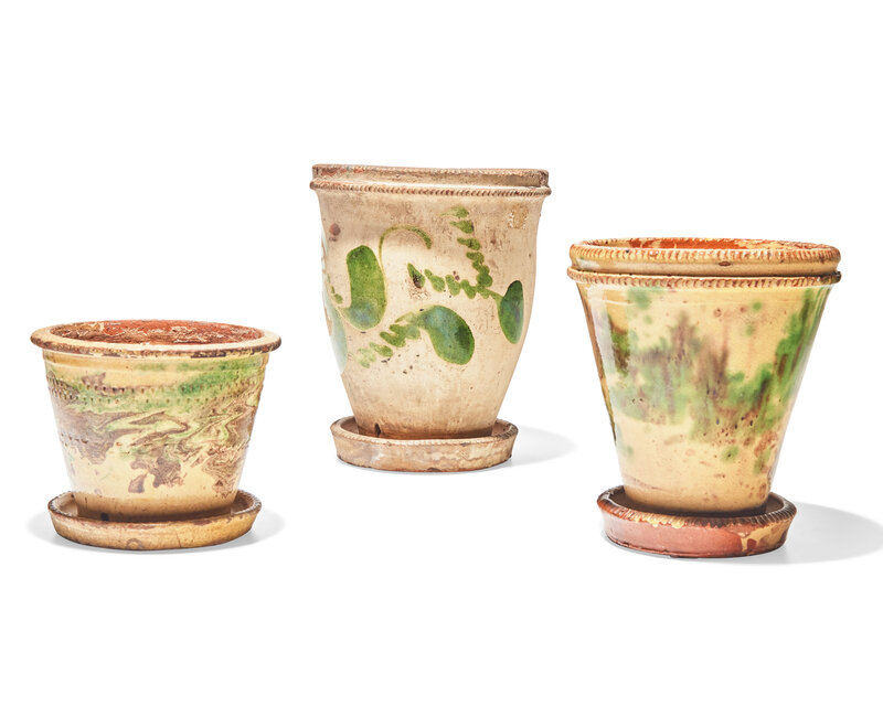 Three Shenandoah Valley Glazed Redware Flower Pots, Attributed to S. Bell & Sons or J. Eberly & Co., Strasburg, Virginia, Circa 1890