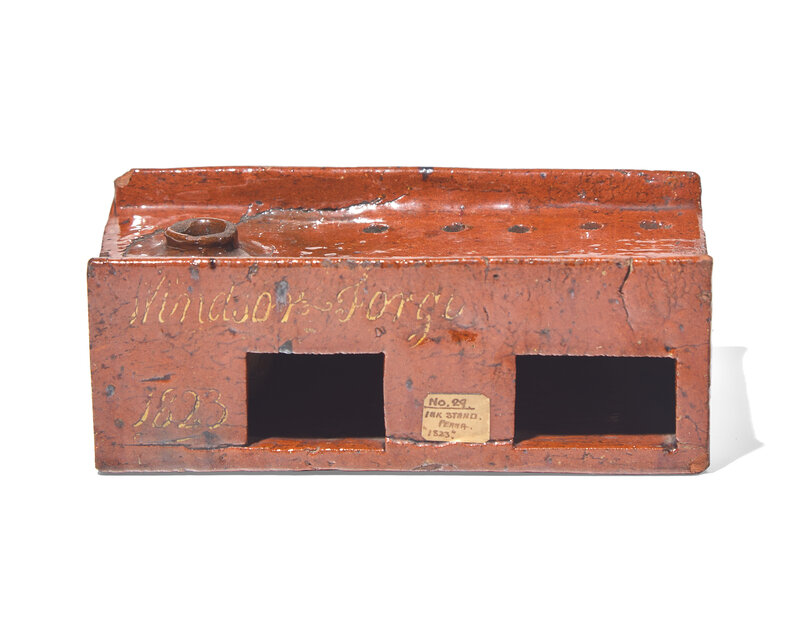Of rectangular form, one side bears inscription, "Windsor Forge" and "1823," and paper label inscribed in ink, "No 29/ Ink Stand/ Penna/ "1823."