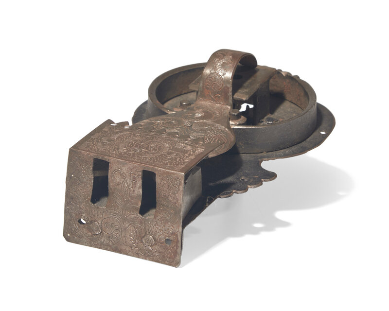 The lock plate engraved with foliate devices and initials, "CF," the key not necessarily original to the lock plate.