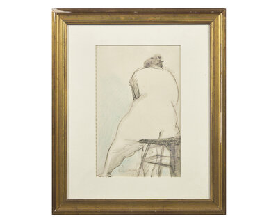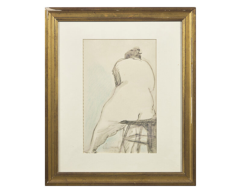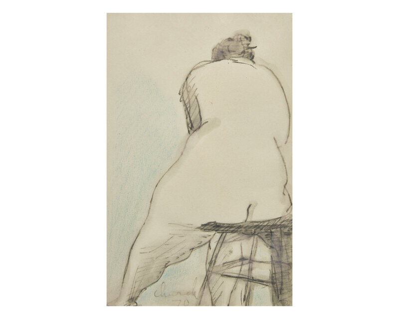 Seated Nude: signed and dated 'Church 70' bottom center left, ink, wash and crayon on perforated sketchbook paper, 9 x 6 in. (22.9 x 15.2cm)