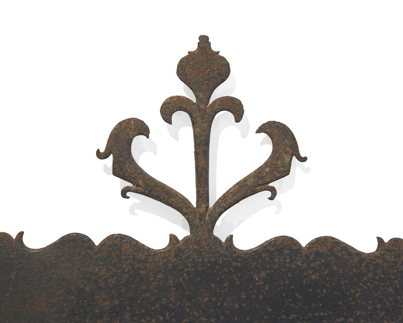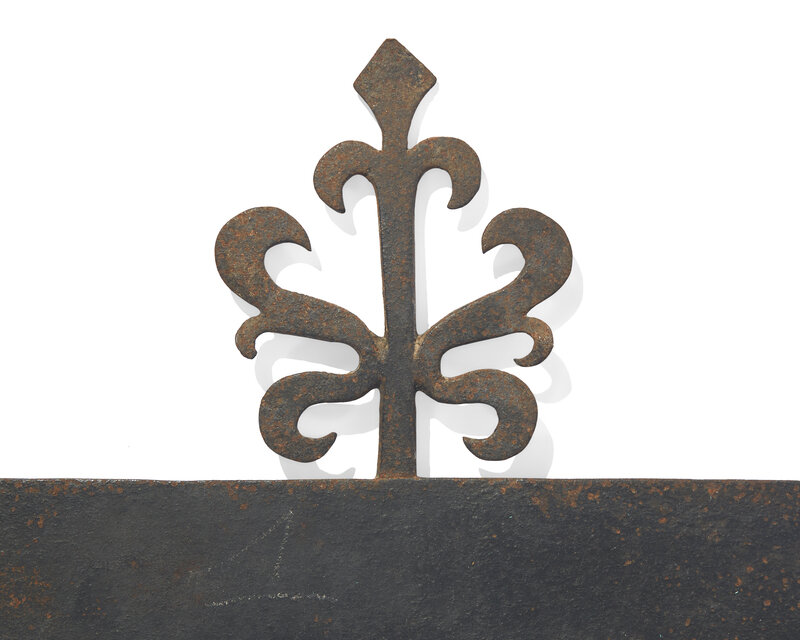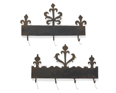 Each surmounted by applied fleurs-de-lis, one with three hooks, the other with four hooks.