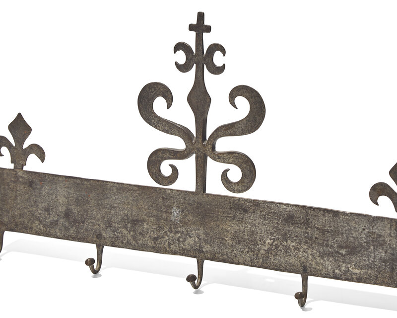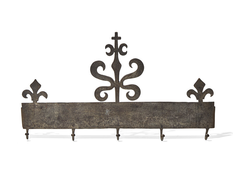 Surmounted by applied cast elements including two fleurs-de-lis and a scrolled device topped by a cross, having five hooks with faceted finials.