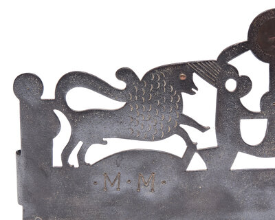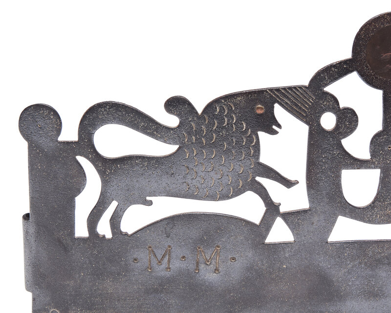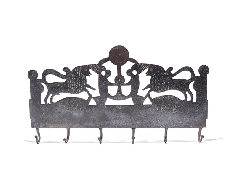 With slight bow-front, with openwork design depicting two lions with copper-inlaid eyes, flanking two kneeling angels, below a copper sun, engraved with initials, "M.M/ F.B," with six hooks.
