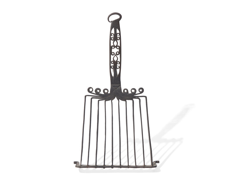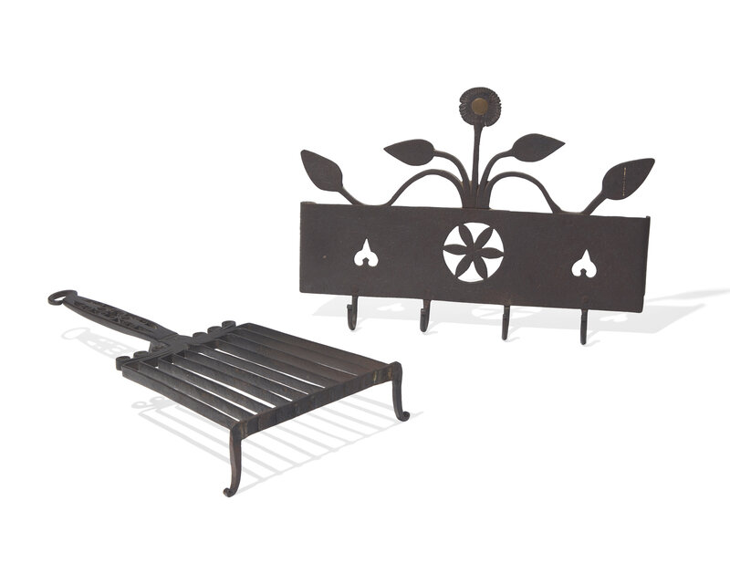 The gridiron with pierced handle, decorated with volutes, the rack with pierced panel with floral and heart devices, surmounted by applied flower with copper-inlaid center, with four hooks.