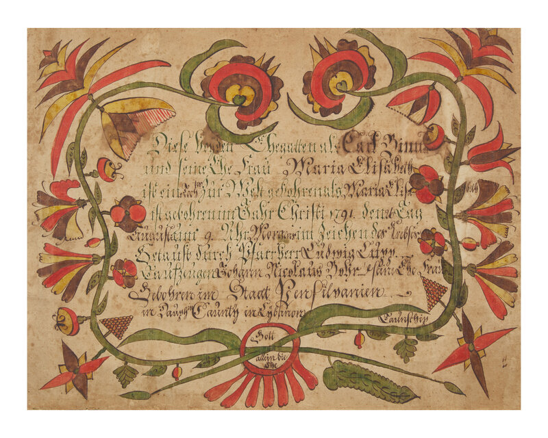 A Fraktur Birth and Baptism Record, Attributed to Arnold Hoevelman (active 1771-1796), Dated "1791"