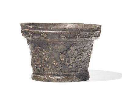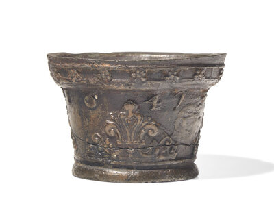 Cast and chased with fleurs-de-lis and date "1647," having a brown patinated surface.