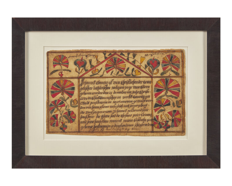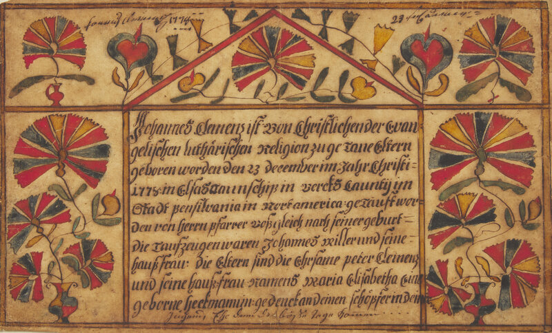 A Fraktur: Birth and Baptism Record for Johannes Clemens, Dated "1778," Attributed to Conrad Trevits (1751-1830), Alsace Township, Berks County, Pennsylvania
