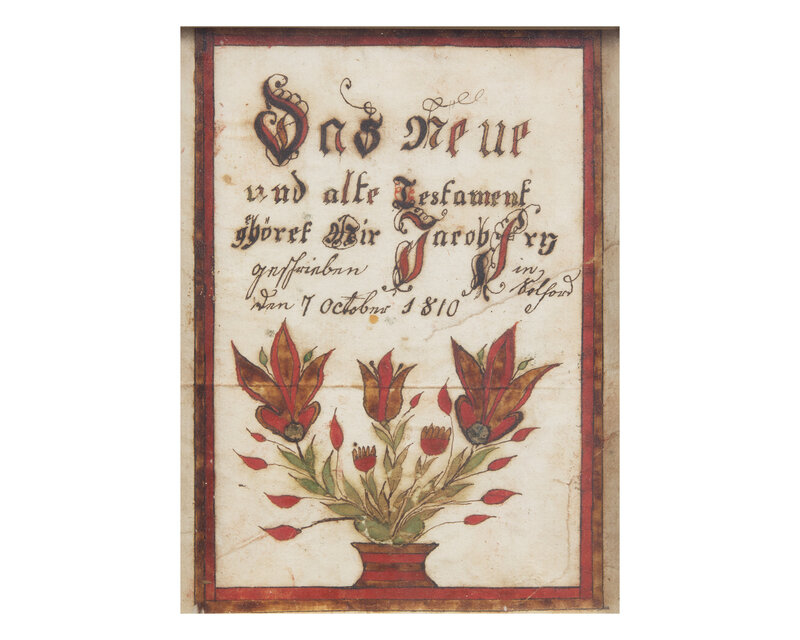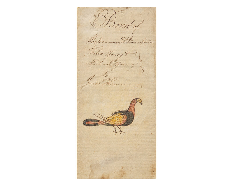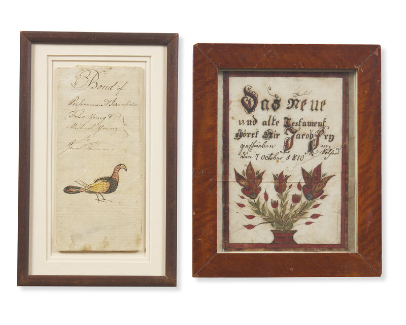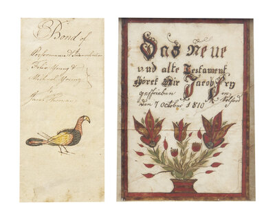 The first, a bookplate for Jacob Fry, Salford, Montgomery County; the second, a bond of indenture for Felix and Michael (Abraham) Young of Dauphin County to Jacob Thomas, illuminated with a bird, folded and framed.