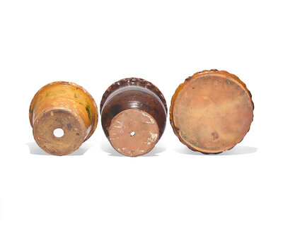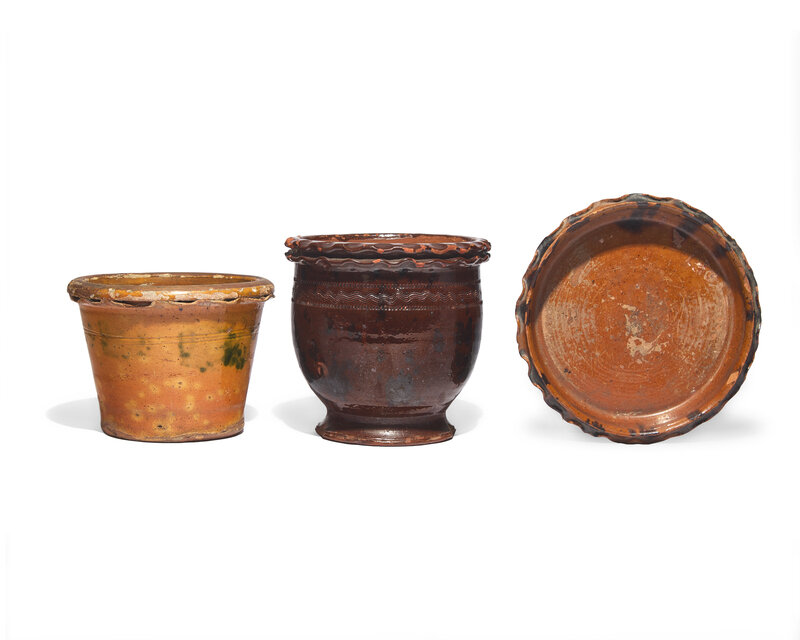 Two Glazed and Incised Redware Flower Pots and a Flower Pot Saucer,