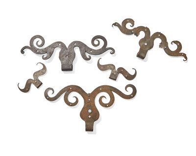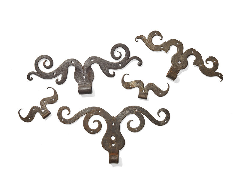 A Group of Five Moravian-Type Wrought Iron Ram's Horn Hinges, Pennsylvania, 18th Century