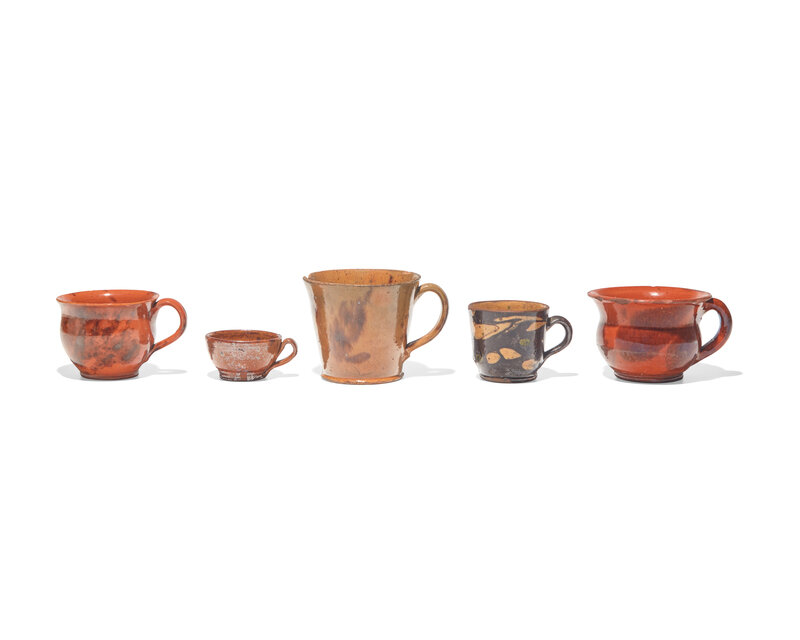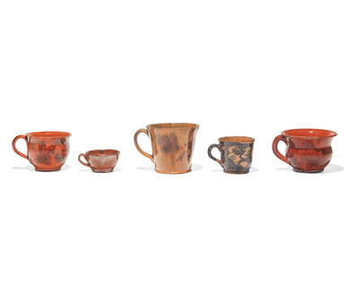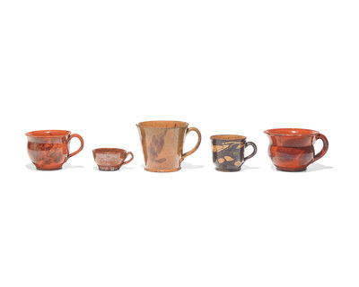 A Group of Five Glazed Redware Mugs and Porringers, Pennsylvania, 19th Century
