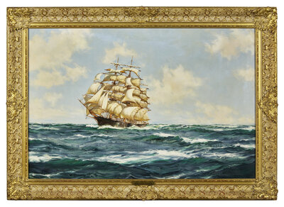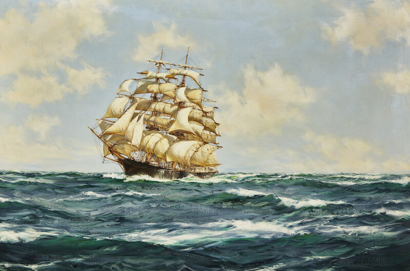 signed Montague Dawson (lower left); titled and inscribed The Clipper North America of Boston.1463 tons. Built 1851. (upper stretcher)