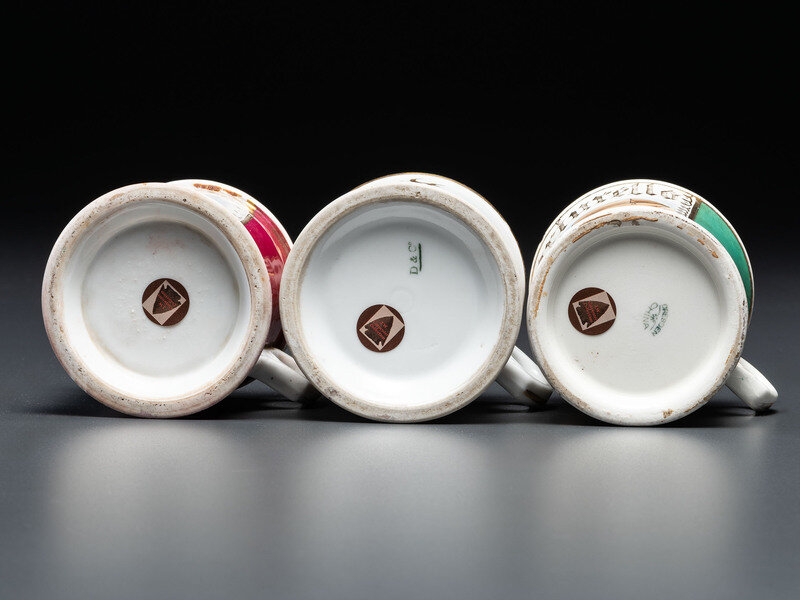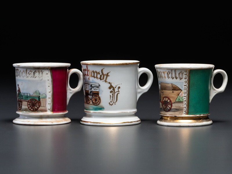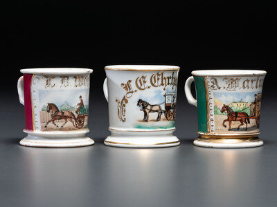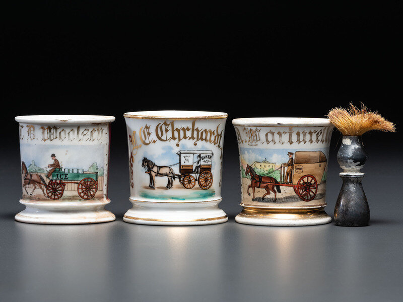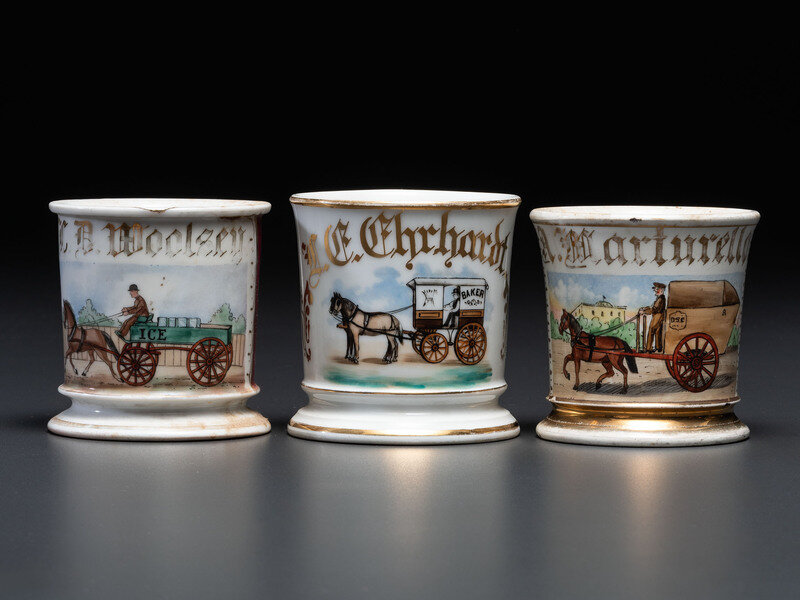 Three Porcelain Occupational Shaving Mugs with Horse-Drawn Carts