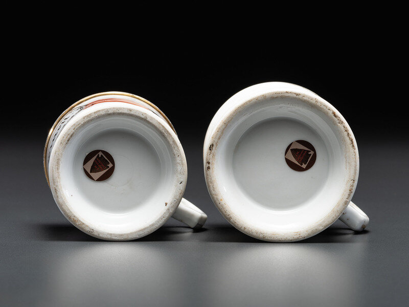 including a gilt-decorated mug reading Nathan Sandt. / Cesspools Cleaned., and a mug depicting a hand holding a business card reading J.G. Cinell.