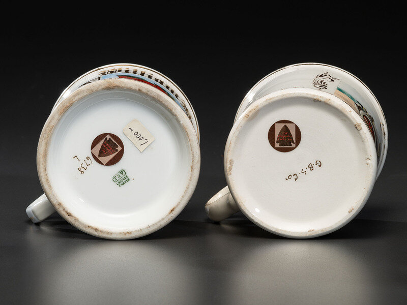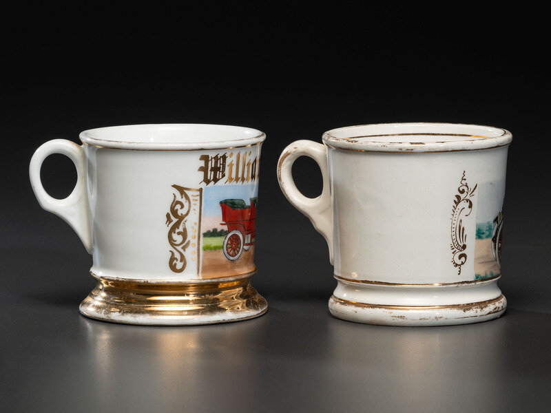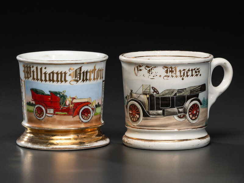 Two Shaving Mugs Depicting Open Touring Automobiles